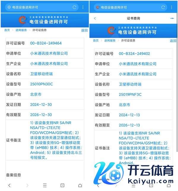 快科技1月6日音问开yun体育网,15 Ultra取得入彀许可,这款机型有两种型号,尺度版型号是25019PNF3C,解救天通卫星通讯,顶配版型号是25010PN30C,同期解救天通卫星通讯和北斗三号短报文。
